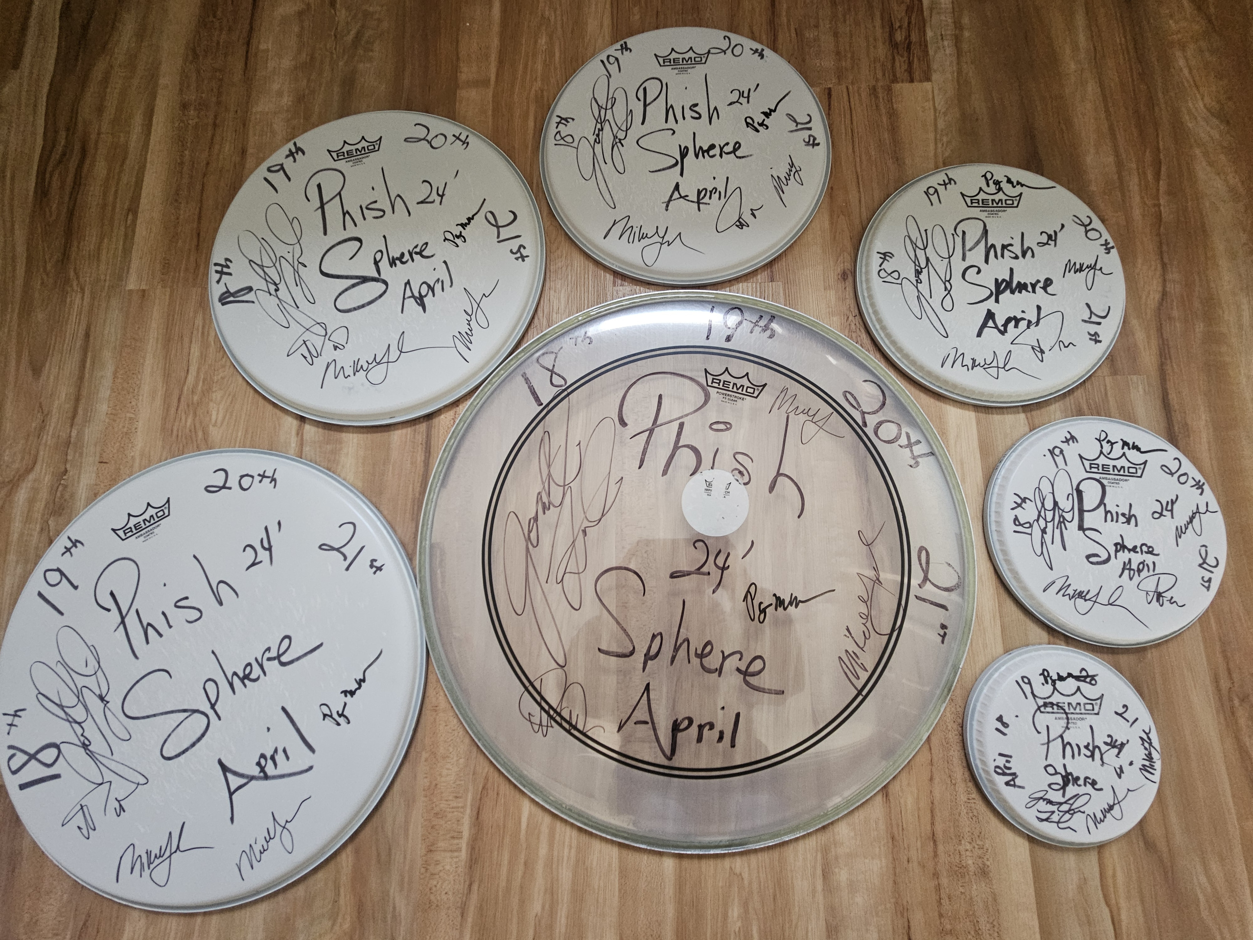 The drumhead is signed by all members of Phish (Trey, Mike, Page, and Jon). The drumhead is the smallest head in the picture associated with this auction item.